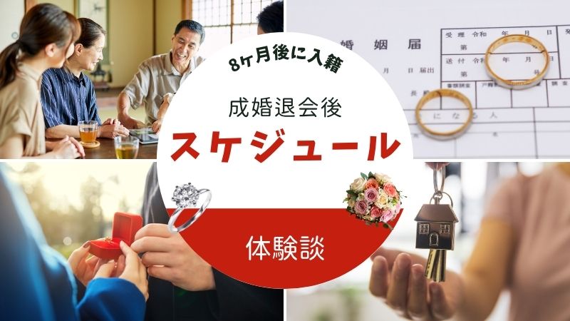 成婚退会後、どのようなスケジュールで結婚まで進んでいったか具体的なスケジュールをお伝えします。成婚退会前に、結婚観のすり合わせが済んでいるため、非常にスムーズに進みました。